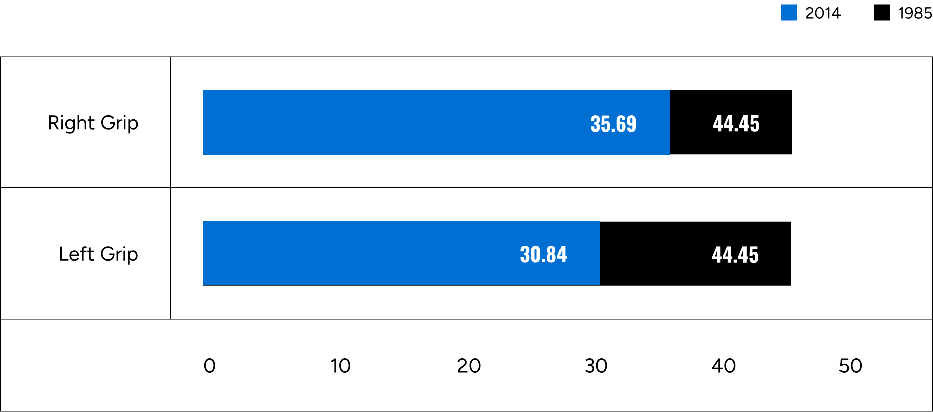 Strength scores were statistically lower that older normative data in all millennial grip strengths. Specifically, this statistically significant trend was observed in all male grip strengths.