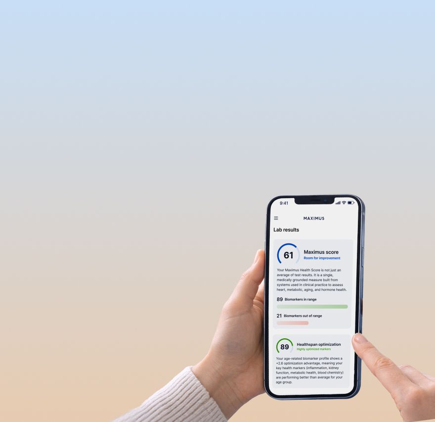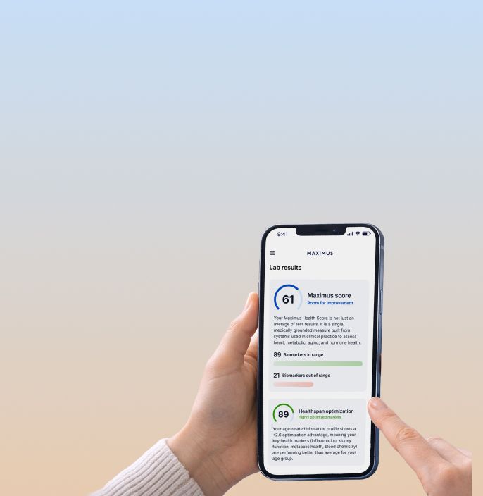 You'll receive personalized health scores showing how your markers compare to optimal ranges, not just standard reference ranges. You'll also get protocol recommendations — including pharmaceutical, supplement, and lifestyle suggestions — tailored to your specific results. If your data reveals optimization opportunities, you can explore Maximus treatment protocols like hormone optimization or weight management.