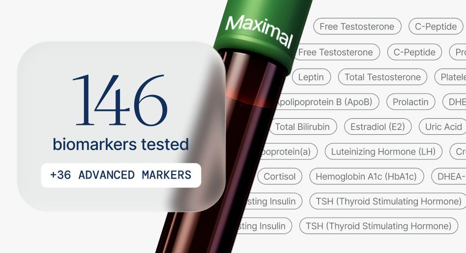 Optimal includes 110 biomarkers covering metabolic health, cardiovascular function, hormones, thyroid, liver, kidney, immunity, and essential nutrients — everything most people need for a comprehensive baseline. Maximal is an upgrade and includes 146 biomarkers — everything in Optimal plus 36 advanced markers for insulin resistance, deeper hormone insights, micronutrient status, inflammation, and healthspan indicators. Choose Optimal for a thorough foundation; choose Maximal if you want maximum visibility with no blind spots.