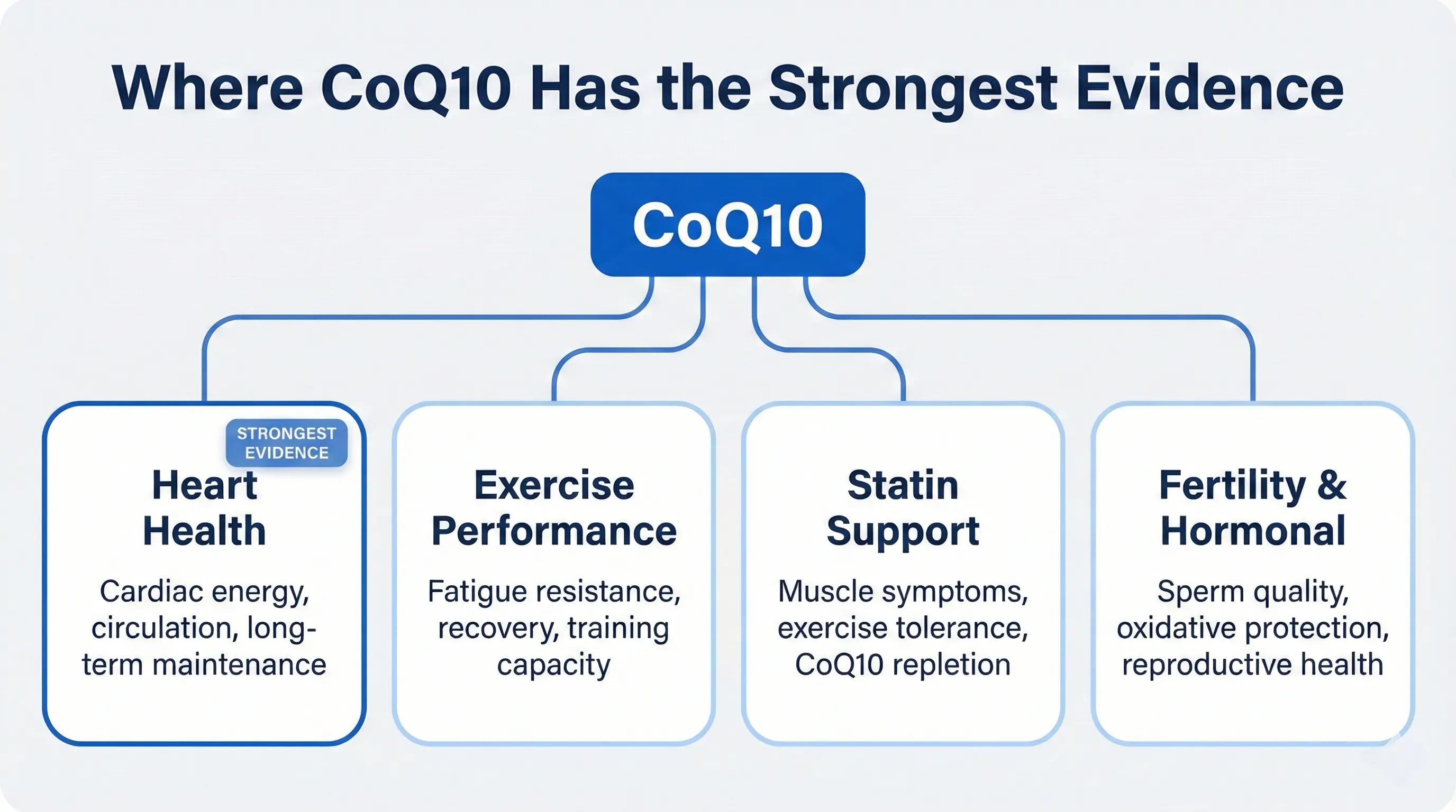 • Supplementing CoQ10 has the strongest evidence for supporting heart function, exercise capacity, and fatigue resistance — particularly in people who are depleted.