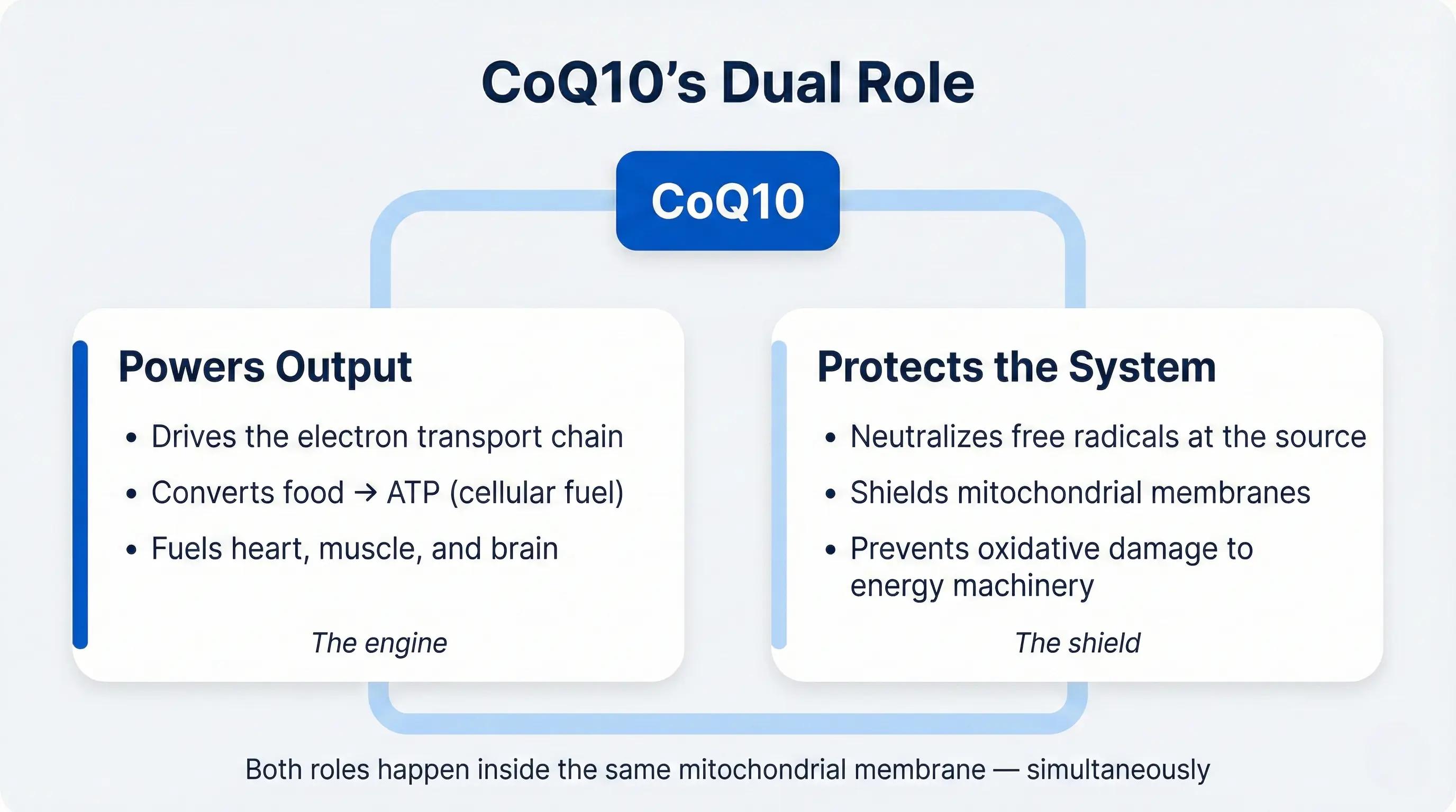 CoQ10 neutralizes free radicals directly within the mitochondrial membrane, protecting the very machinery that produces your energy. This dual role — energy production and antioxidant defense — is what makes CoQ10 uniquely valuable. It supports output and protects the system simultaneously.