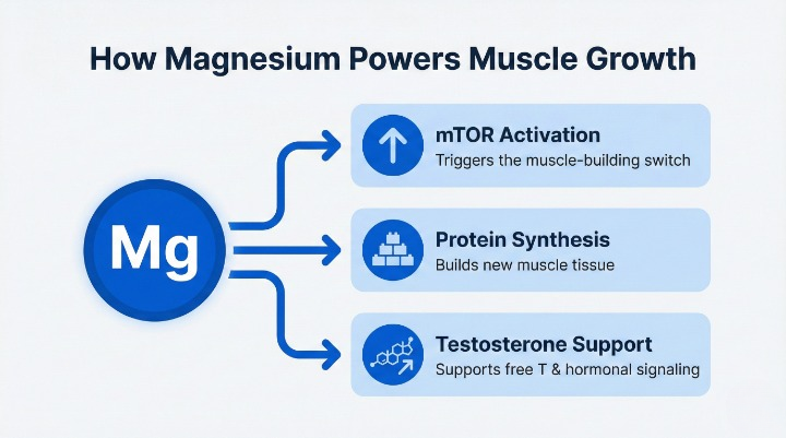 Magnesium supports muscle growth by enabling mTOR signaling, protein synthesis, and healthy testosterone biology, and supports recovery by regulating cramps, ATP regeneration, and sleep quality.