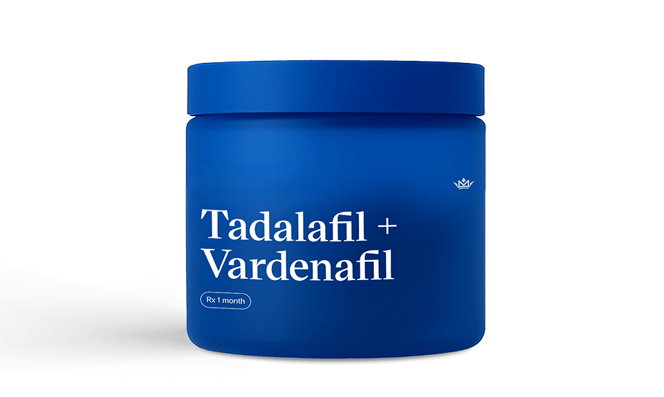 Vardenafil + Tadalafil is a synergistic combination of two medications, which increases blood flow better than ED medications alone, while also working through the central nervous system to elevate drive, endurance, and satisfaction.